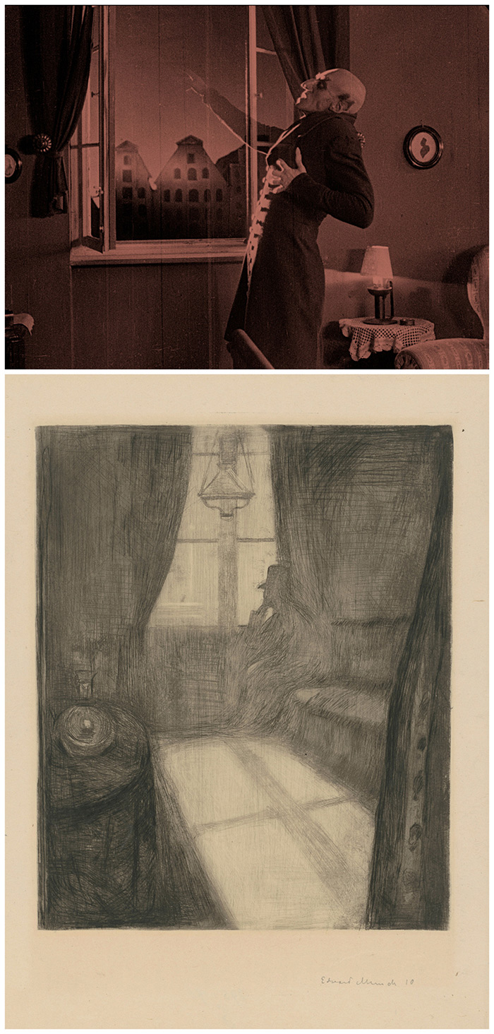 于是,他來了,他來了,格勞帶著自己的藝術素養走進了《諾斯費拉圖》。隨便來幾張電影截圖,你能從中看到德國浪漫主義畫家大衛·弗里德里希的油畫,也能看到西班牙浪漫主義先驅弗朗西斯科·戈雅的版畫,以及現代表現主義繪畫先驅、挪威畫家愛德華·蒙克的平面蝕刻。