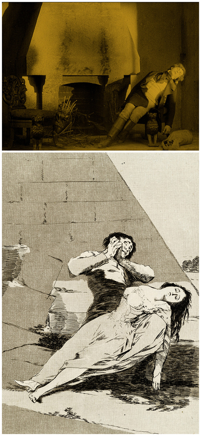 上圖:電影劇照;下圖:“Tantalo”《奇想集》(Los Caprichos,另譯“狂想曲”)銅版畫系列80幅中的第9幅,戈雅(Francisco José de Goya y Lucientes,1746-1828),1797-1798