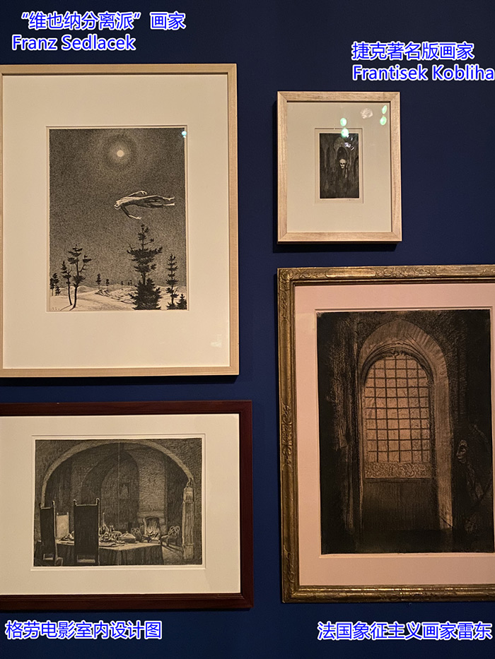 《諾斯費拉圖》電影中所有的室內設計均出自格勞工作室,在展覽現場,布展方將格勞的其中一張室內設計手稿與另外三幅作品同置一隅,頗為令人玩味。三幅作品分別出自法國象征主義畫家雷東、捷克著名版畫家弗朗齊歇克·科布利哈、以及“維也納分離派”成員、奧地利畫家弗蘭茨·塞德拉切克,這三位藝術家均以神秘主義氣息而聞名。