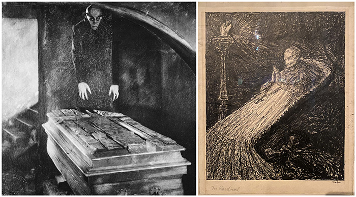 然而,如果沒有藝術史上的先例,《諾斯費拉圖》的誕生也是不可想象的。比如,電影布景設計的草圖會讓人聯想到戈雅的蝕刻版畫、德國浪漫主義以及20世紀初期奇幻藝術的身影。于是在展覽現場出現了跨越時空、別出心裁的藝術交流,19世紀德國浪漫主義風景畫家大衛·弗里德里希、蒙克、奧地利象征主義和表現主義畫家庫賓等藝術家的作品,與《諾斯費拉圖》的電影海報、劇照、手稿等等同場相遇,出乎意料卻毫不違和地為大家提供了一次大聊特聊藝術“鬼話”的機會。