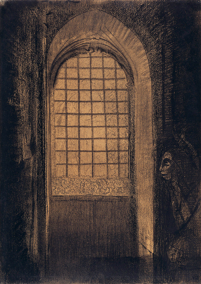 “教堂之窗”(Church Window),雷東(Odilon Redon,1840-1916),1890-1895,木炭素描,德國國家博物館之夏夫-格斯騰貝格收藏館館藏