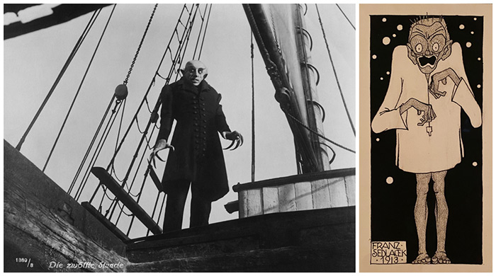 左圖:電影劇照;右圖:“悲傷幽靈”(The Sad Spectre),弗蘭茨·塞德拉切克,1913,奧地利 O? Landes-Kultur GmbH 藏品