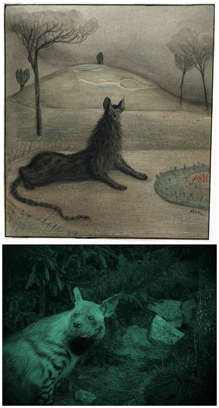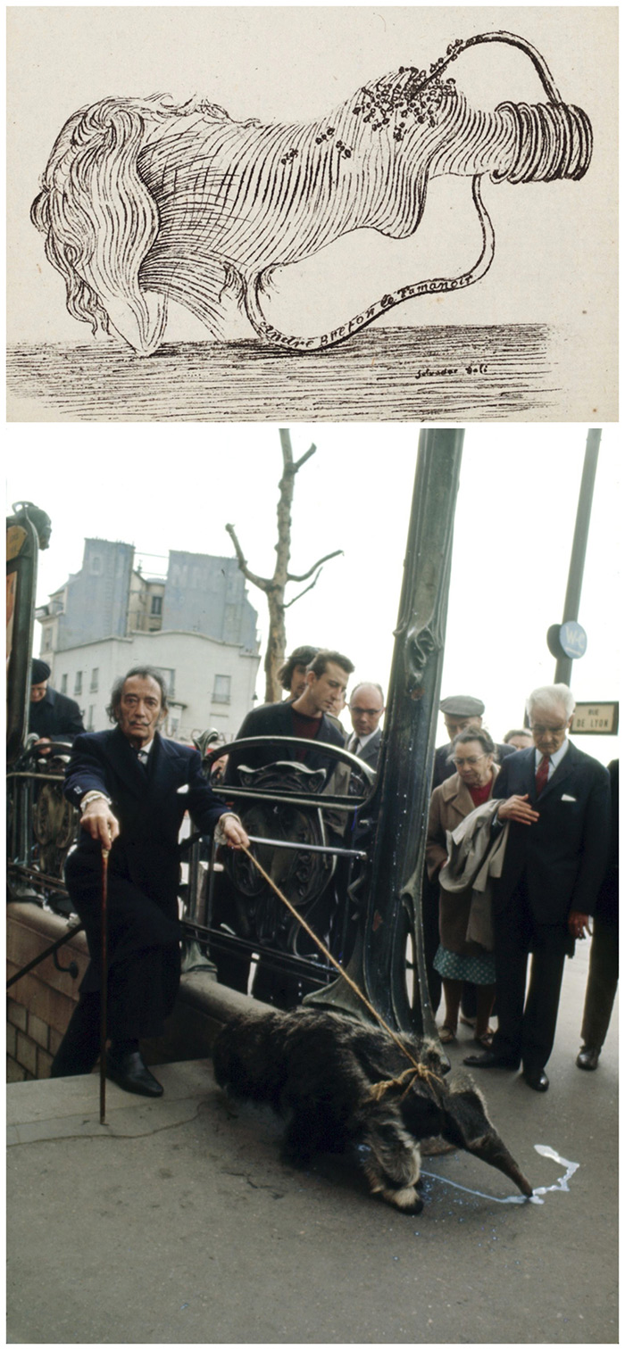 上圖:“食蟻獸”(The Anteater | Exlibris for Andre Breton),達利(Salvador Dalí,1904-1989),約1930,私人收藏;下圖:“巴黎街頭的達利與食蟻獸”,帕特里斯·哈班斯(Patrice Habans,1937*),1969,私人收藏