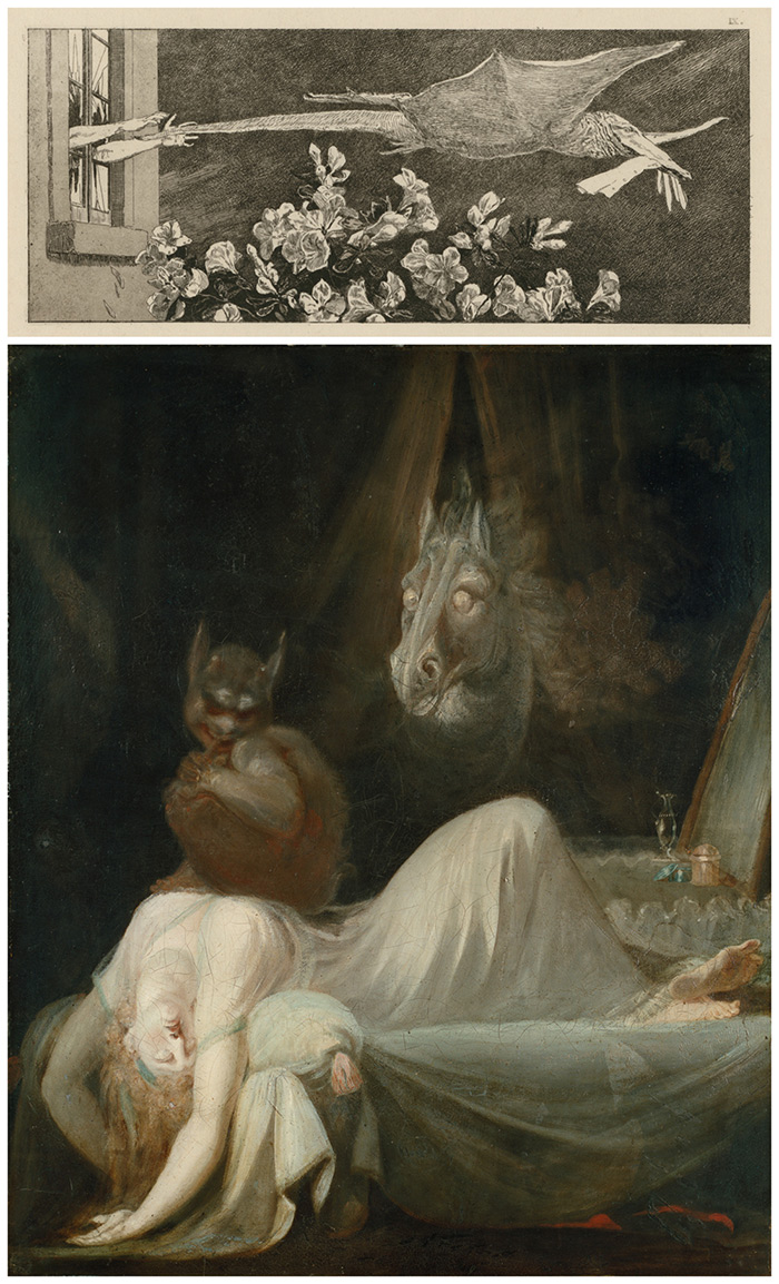 上圖:“關于尋找一個手套的釋義”(A Glove,fol.9:The Abduction),馬克斯·克林格爾(Max Klinger,1857-1920),1882,蝕刻版畫,德國國家博物館之版畫素描博物館館藏;下圖:“噩夢”(The Nightmare),約翰·菲斯利(Johann Heinrich Fussli,1741-1825),1790/91,德國法蘭克福歌德故居藏品(Frankfurter Goethe-Haus)