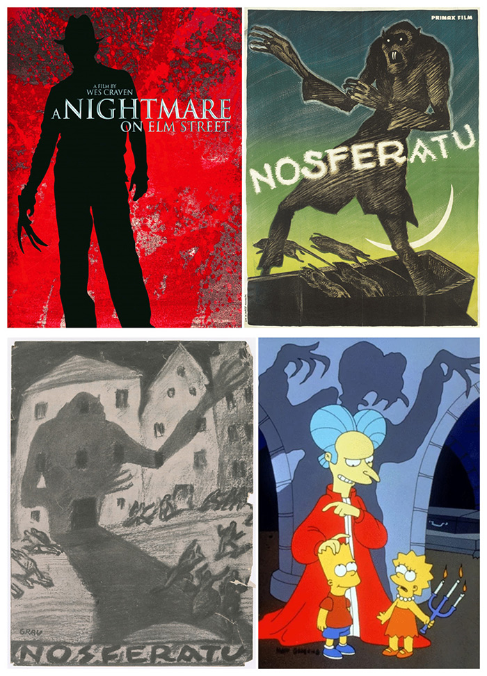 左上:電影《猛鬼街》海報;右下:《辛普森一家》動畫劇照;右上&左下:《諾斯費拉圖》電影海報,阿爾賓·格勞(AlbinGrau,1884-1971),1920年代