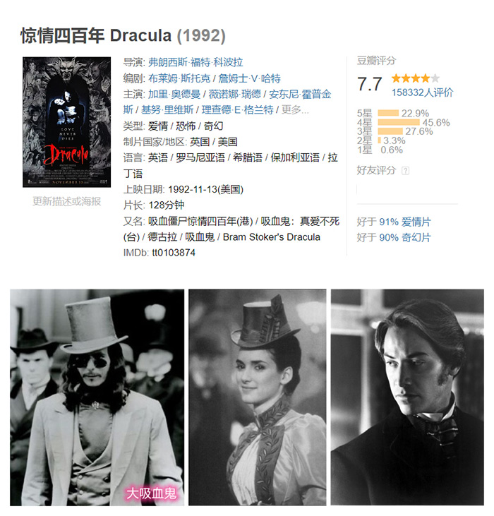 電影上映70周年時,執導《教父》系列的大導演科波拉以《諾斯費拉圖》為原型,翻拍出一部《驚情四百年》,加里·奧德曼、安東尼·霍普金斯加上顏值巔峰期的薇諾娜·瑞德和基努·里維斯共同演繹了這個故事。