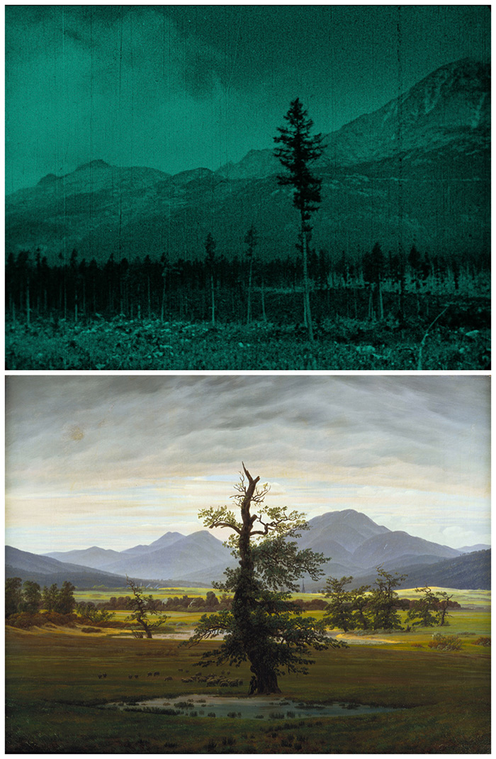 上圖:電影劇照;下圖:“孤樹”(Der einsame Baum),大衛?弗里德里希(Caspar David Friedrich,1774-1840),1822,德國柏林國家畫廊館藏(Nationalgalerie,Staatliche MuseenZu Berlin)