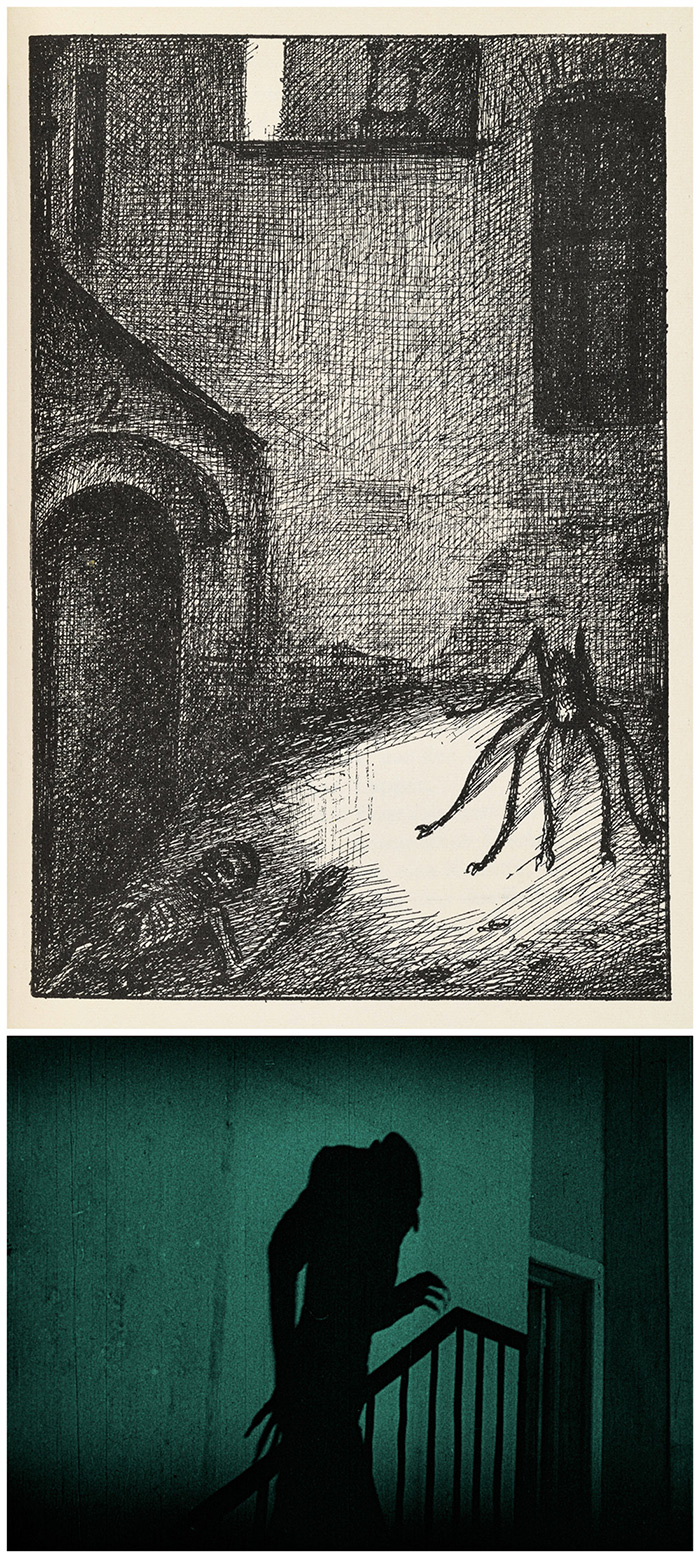 上圖:“蜘蛛”(Die Spinne?),庫賓(Alfred Kubin,1877-1959),1909,德國國家博物館之版畫素描博物館館藏;下圖:電影劇照