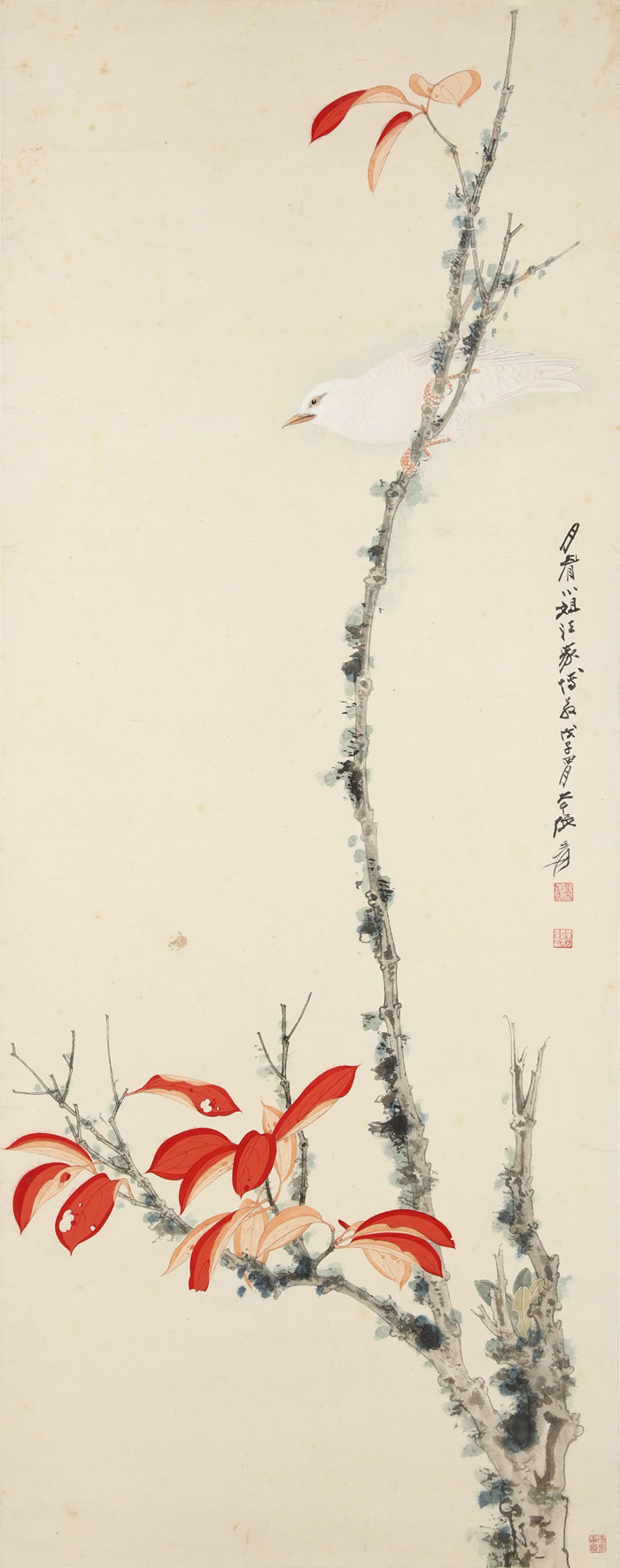 張大千 《紅葉白羽》設色紙本立軸 1948年作 114x46公分估價:HKD7,000,000-10,000,000來源:1.佳士得 1993年秋拍Lot276;2.謝月眉女士舊藏。說明:上款人「月眉小姐」即謝月眉,系張大千至交好友謝稚柳胞妹。