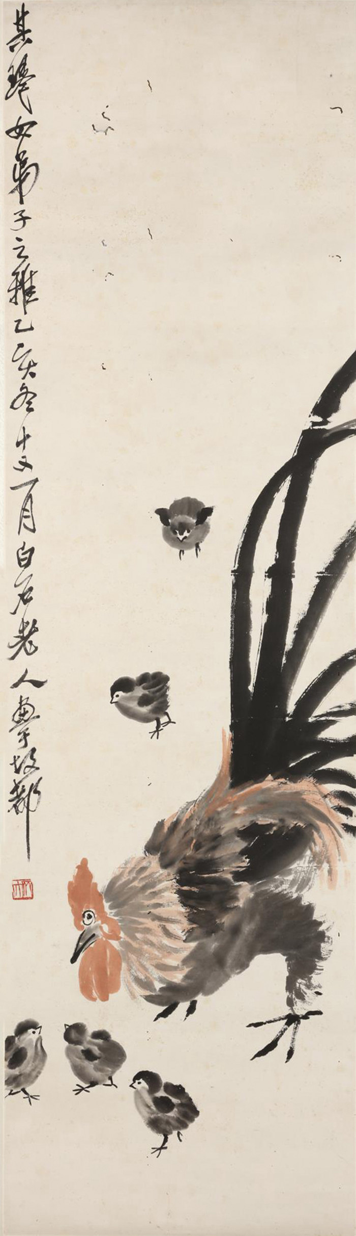 齊白石《教子圖》設色紙本鏡心 1935年作 136.5x40公分估價:HKD800,000—HKD 1,200,000鈐?。糊R大題識:其琴女弟子之雅。乙亥冬十又一月,白石老人畫于故都。