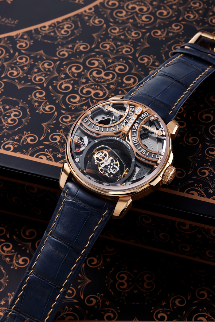 海瑞溫斯頓極罕有及創新,18k紅金鏤空腕表,配三軸陀飛輪、逆返跳時、逆返分鐘及動力儲存,限量生產僅10枚,Histoire De Tourbillon 9,型號HCOMTT47RR002,約2018年制估價: HKD 1,400,000-2,000,000