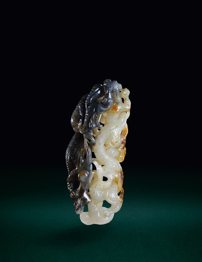 宋黑白玉巧色雕雙龍紋佩 H 8.6cm估價:HKD 1,000,000 - 1,200,000來源:天玉居收藏出版:郭典霖,《天玉居藏玉:唐宋遼金元明清玉器》編號75