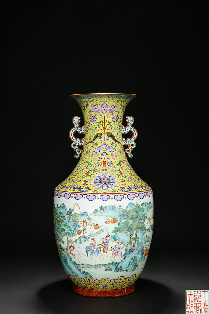 清嘉慶黃地洋彩八蠻獻寶雙龍耳大瓶「大清嘉慶年制」 H 74cm估價:HKD 16,000,000-25,000,000來源迪諾公爵 Alexandre Edmond de Talleyrand-Perigord (1813-1894年),此后家族傳承
