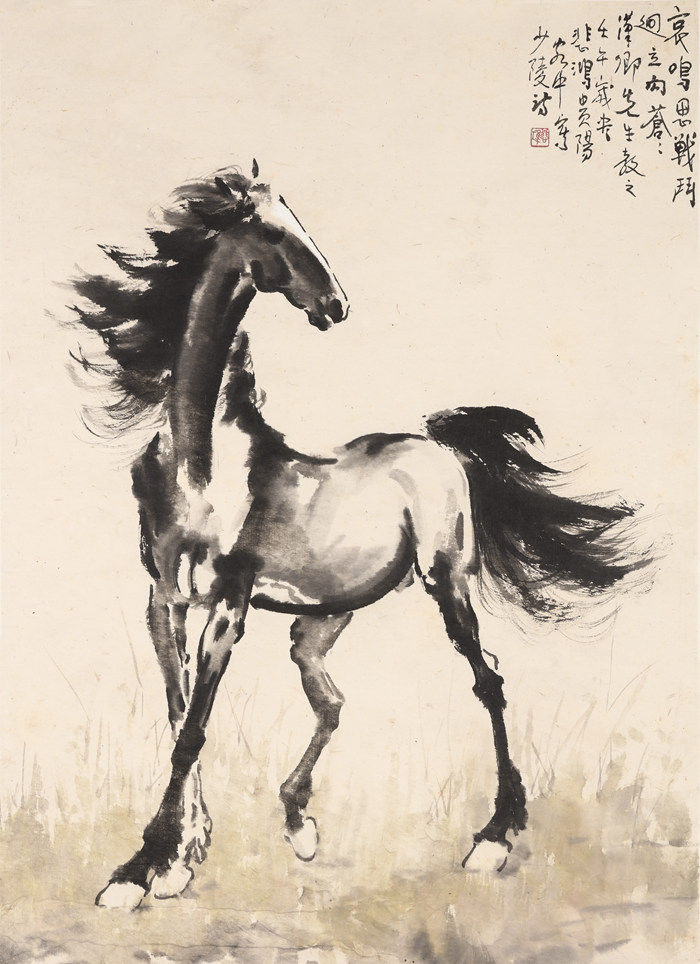 徐悲鴻 《哀鳴思戰斗》設色紙本鏡心 1942年作 73.5x53.5公分估價:HKD7,000,000-9,000,000來源:1.蘇富比(臺北)1995年定遠齋專拍;2.張學良舊藏。說明:上款人「漢卿先生」即張學良。