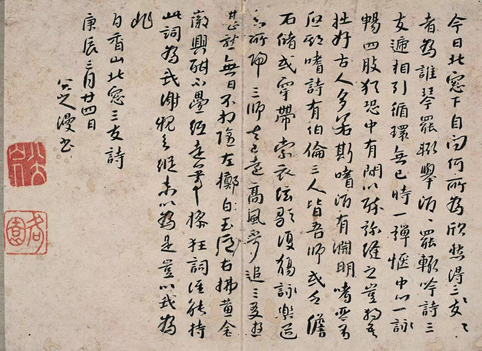 八大山人 1700年作行書白居易詩 鏡心 28×37.3公分 估價: HKD 500,000-600,000 款識:白香山北窗三友詩,庚辰三月廿四日八大山人漫書 鈐?。喊舜笊饺耍ò祝┖螆@(朱)