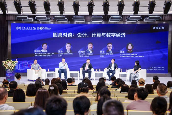 此外,論壇還設置了圓桌對談環節。參與對談的嘉賓有清華大學美術學院副院長、《裝飾》雜志主編方曉風,興業銀行金融科技研究院負責人李鋒,清華大學經濟管理學院副院長何平,清華大學計算機科學與技術系教授黃民烈,清華大學美術學院黨委副書記、清華清尚智慧場景創新設計研究院副院長吳瓊。對談嘉賓們各抒己見,圍繞“設計、計算與數字經濟”的話題,展開了思想的交流和碰撞。
