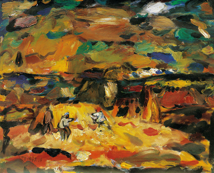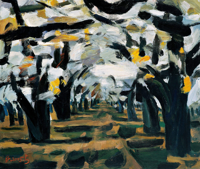 畫中那些山頭、房屋、樹木、土地,是滿眼色彩和大刀闊斧的筆道刮刀織就的彩綿,讓人觀之心靈激蕩,沉陷其中。它讓我們知道繪畫性要義不是模擬自然之物,而是傳遞畫中的詩意和這個時代畫家的心靈。