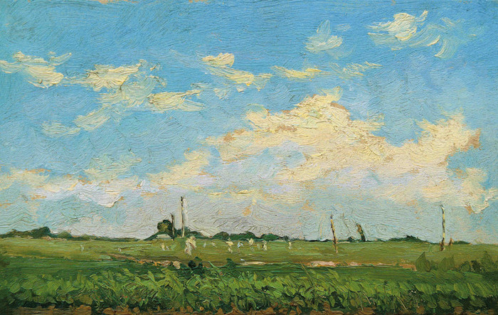 他筆下的田園風景有異想天開的成分,如一大片綠色遼闊倒過來的天,也如海上奔騰而來的白浪之路,動蕩不已又清晰可辨。他更多時候只畫綠色一片,深不可測而又簡約平靜,富有詩意和哲理。