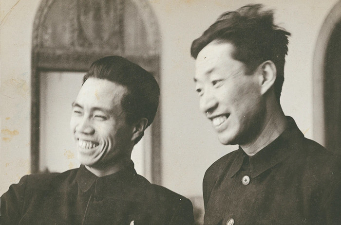 1959年中央美術學院師生合影,第二排右起為戴澤,韋啟美,蕭淑芳,艾中信,吳作人,陳沛。第三排站立者右一為王征驊,右二為尹戎生,右三為靳尚誼。茶幾右側為吳小昌
