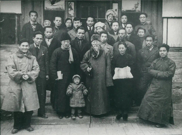 1946年,北平藝專和北平美術工作者協會同仁攝于北平藝專。一排右起:右一戴澤,右三齊白石,右四徐悲鴻;二排右起:右三盧光照,右四李可染;三排右起:右一董希文