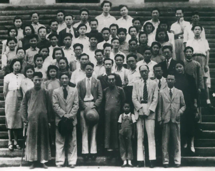1944年,中央大學國畫系、西洋畫系、音樂系師生照。前排左起傅抱石、徐悲鴻、黃顯之、陳之佛、許士騏、費成武