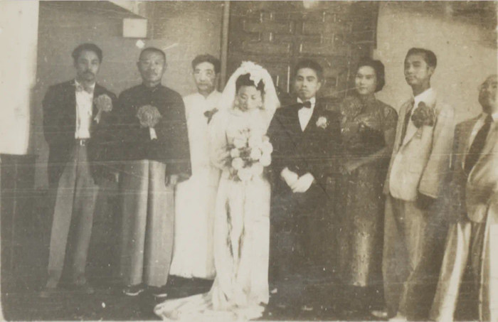 1948年,戴澤結婚照,從左數起:左一新娘老師葉淺予,左二新娘陳碧茵父親,左三證婚人徐悲鴻,左四新娘陳碧茵,從右數起:右一介紹人孫昌煌,右三徐悲鴻夫人廖靜文,右四新郎戴澤