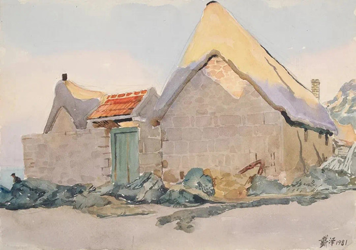《山東大魚島陽光下的海草房》紙本水彩 27.5×39cm 1981年