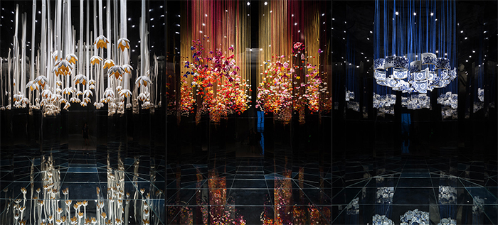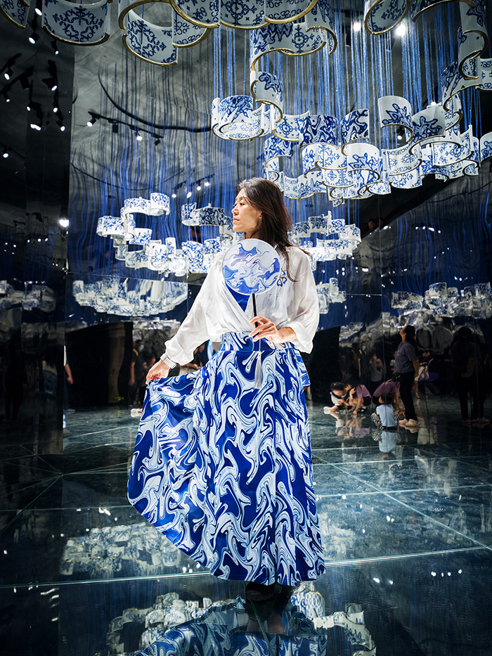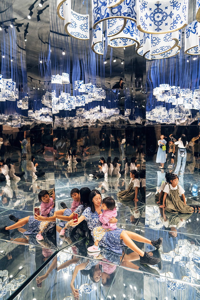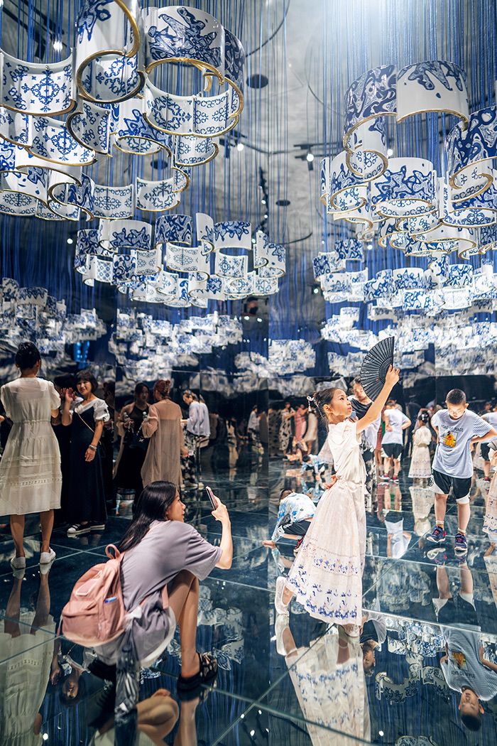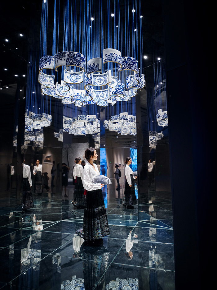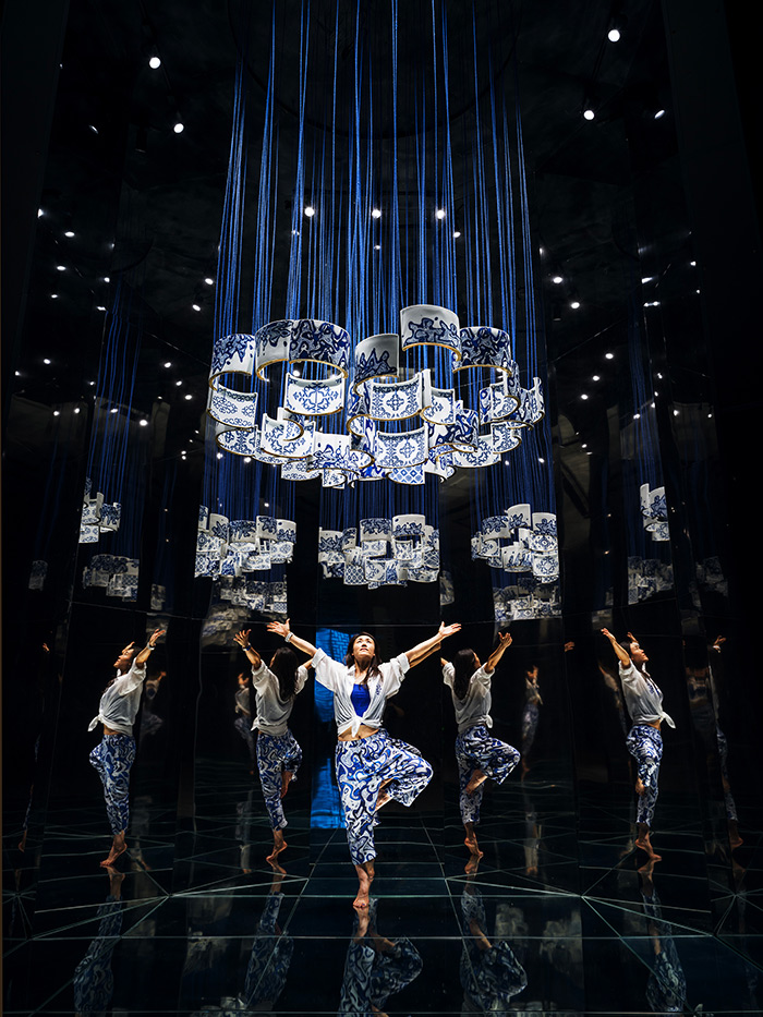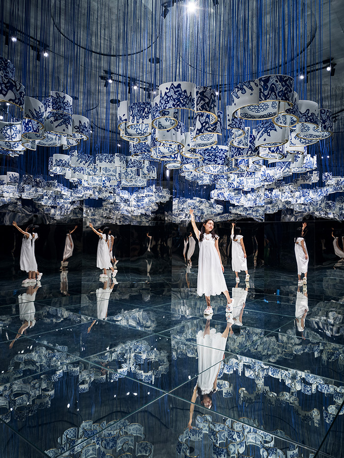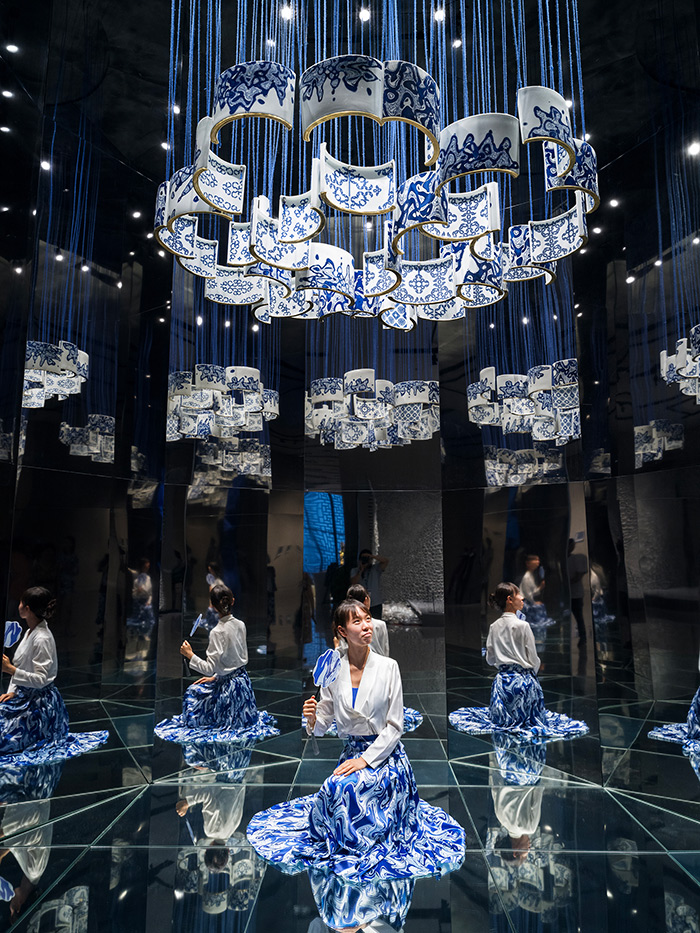 朱陽提及在《花的精神》的創作中,用了九面墻面鏡面,和一面地面鏡面,合為十面鏡子,這是對明代畫家吳彬創作的《十面靈璧圖》的引用,強調中國人以動態的方式欣賞自然中的豐富變化,這是以中國動態審美為內核的當代表達。他還以“花的三重境”作品創作為例,指出所有的符號都來自于中國傳統文化中的美學編碼的當代化的重構,從而產生了當代的中國式符號的“生成器”,以當代的技術和觀念進行具有中國美學主張的新符號的生成。其中這件作品的數字青花裝飾的創作過程是對古代康熙官窯青花瓷藝術形式意味的解構和重構。