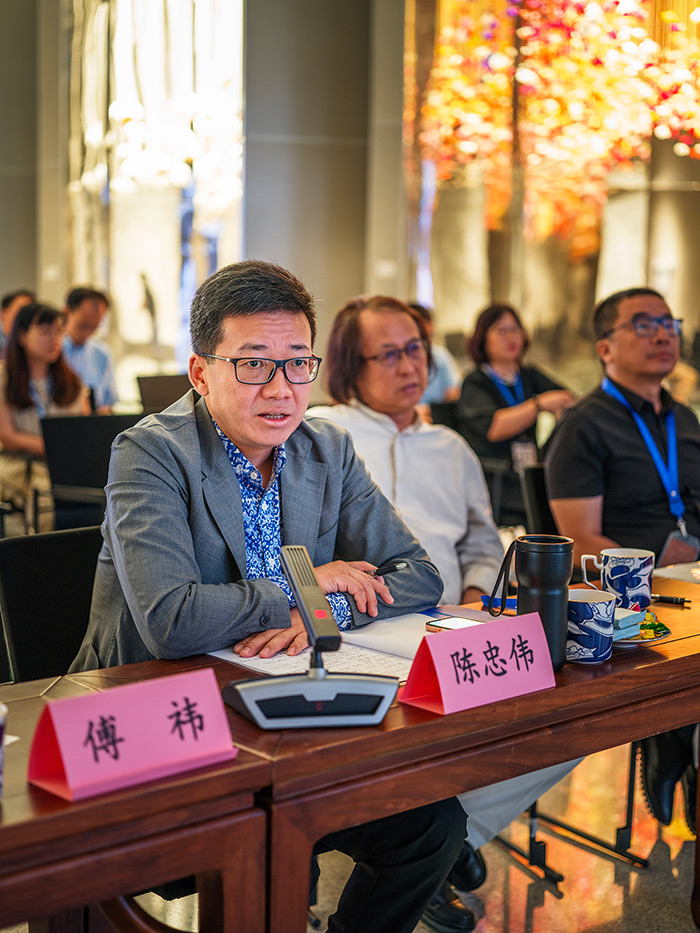 接下來,是周南先生發言,他回憶30年前,在上海首次看到朱老師的作品,令其印象深刻。其在韓國做的環境陶瓷作品令其震撼,澳門的《蓮之鏡像》作品為陶瓷藝術打開了新的空間,此次展覽是一場藝術的盛宴。同時也拓展了工藝美術和美術之間的界限,模糊了兩者的邊界。工藝美術的形態在當代的轉換是一個大問題,2000多年前的《考工記》記載的工藝美術的標準為:“天時、地氣、材美、工巧”,幾年前中國藝術研究院開創“好手藝”工藝美術展,提出“材美、工巧、氣韻、視野”。其中,視野就是指跟隨時代。當下的時代具有以下特點:數字化、互聯網、元宇宙、交互體驗、綠色、低碳,朱老師的展覽無疑呈現以上特征。這也是受觀眾歡迎,并引起社會關注和社會共鳴的主要原因。其作品也是跨學科的,展陳方式獨特,為大家提供了鮮活的范例。他希望朱老師在國內外做巡回展,把中國當下的藝術與世界分享,同時也希望朱老師與陳總強強聯合,從藝術端到生活端,把這兩端緊密的連接起來,真正實現藝術走向生活。