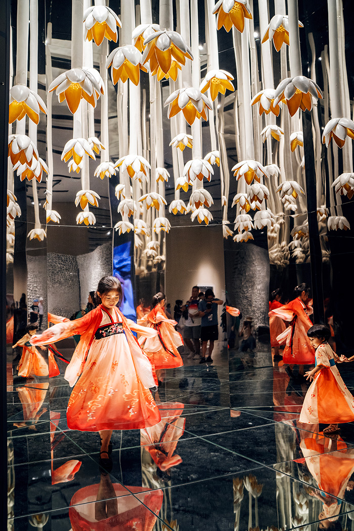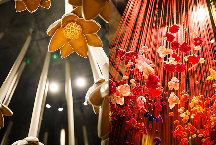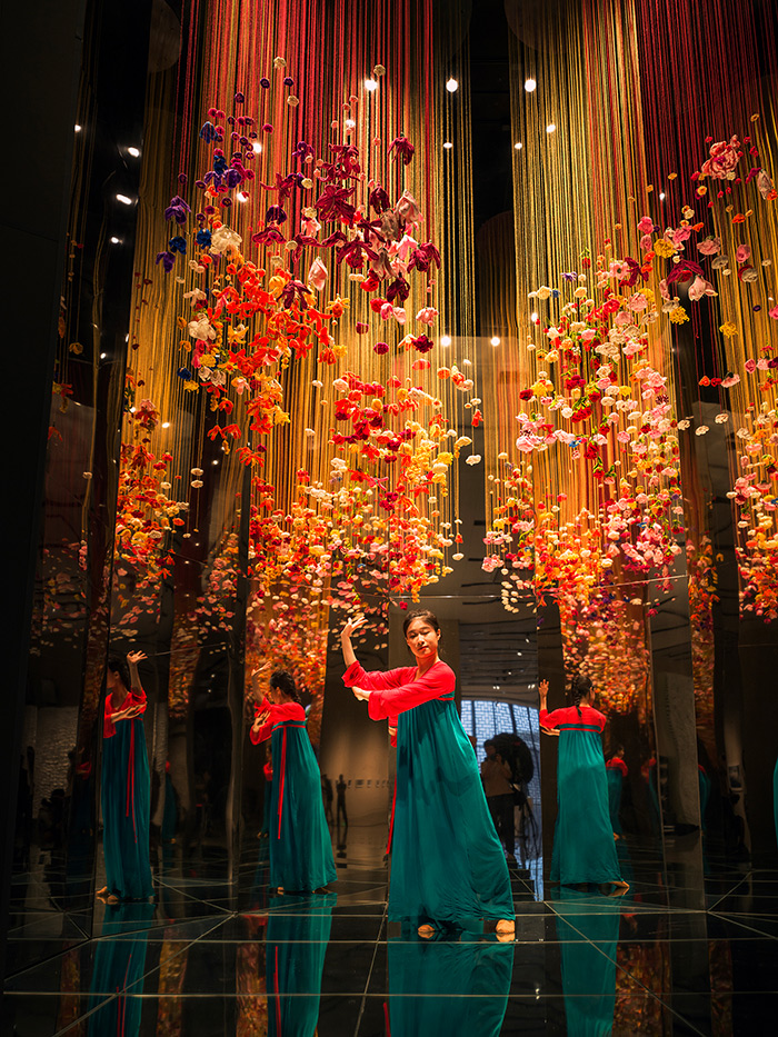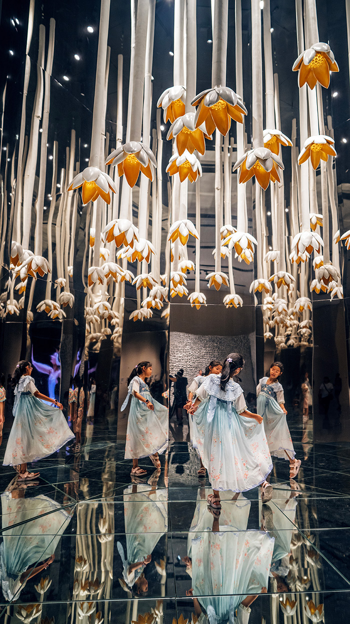 第二個含義就是代際之間的傳承與創造,主要是朱樂耕和朱陽兩代人之間合作與傳承。2015年,兩人合作把建筑上的作品移到中國美術館。2021年,兩人再次合作,又把建筑上的作品變成獨立空間藝術在澳門展出。朱樂耕工作室成立后,朱陽帶領團隊,創作了系列大型鏡像裝置藝術作品,如蓮之鏡像的君子之花,絨線的記憶之花,園林花窗組成的文化之花組成“花的三重境”。