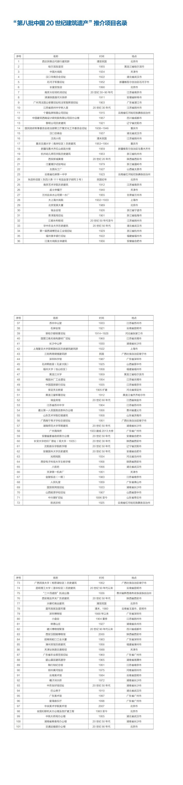 第八批推介項目中也包括多項體現改革開放精神的項目,比如招商局蛇口工業大廈和深圳博物館;體現中國建筑技藝蓬勃發展,對中華現代文明有表征自信意義的項目,如北京發展大廈、金陵飯店(一期)、廣州珠海橋、津浦鐵路淮河大鐵橋、橘子洲大橋、韶山灌區建筑遺存;以及在當代語境下凸顯地域文化價值的項目,如西安漢陽陵博物館、長富宮飯店、交通運輸部辦公樓;還有海外建筑師、普利茲克獎獲得者磯崎新設計的中央美術學院美術館,被認為是本次推介項目中的當代建筑亮點。