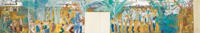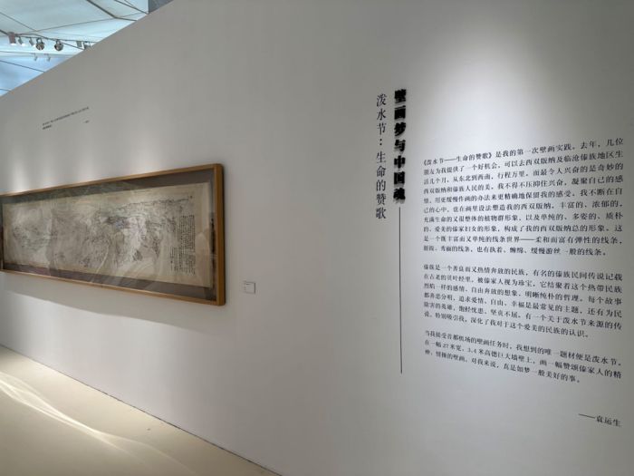 壁畫貫穿于袁運生的藝術歷程,展覽將他在人生的四個時期創作的《水鄉的記憶》《潑水節——生命的贊歌》《紅+藍+黃=白?——關于中國的兩個神話故事》《世事萬變不拘》《紙醉金迷》《夫子琴思》《縱浪大化》《夸父逐日》《共工觸不周山、女媧補天》九幅節點性的壁畫作品或其圖像,匯聚一堂。