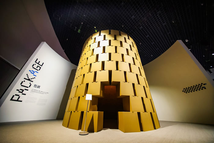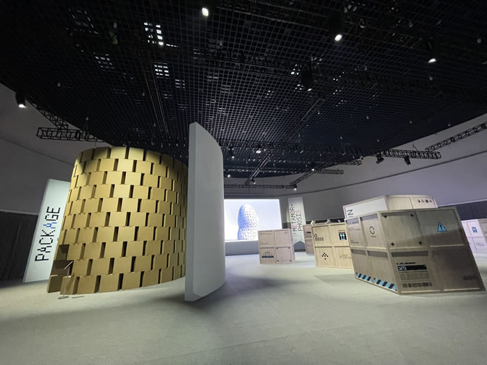 懷揣著這樣的好奇心循聲而往之,我們繞過“拉鏈”來到了瑞士藝術家齊蒙(Zimoun)的聲音裝置作品前,這是一方用幾百個60厘米見方的紙板箱搭建的空間場域,藝術家巧妙地將包裝盒賦予生命,它們似乎不再只是工具,持續的敲打逐漸喚醒它們的人格,震耳發聵的場域影射著這個信息不斷交流與發布的社會……與此同時,這些紙板箱也象征著服裝流通過程中的包裝盒——平日里它們被打開后就會被很快丟棄,人們很少去思考其為了到達消費者手中所經歷的歷程。而在這件作品中,紙盒以藝術裝置的面貌作為主體出現在人們面前,試圖以此延展討論服裝產業和符碼演繹的“流通”階段,引導觀眾關注與思考與其相關的社會與環境問題。
