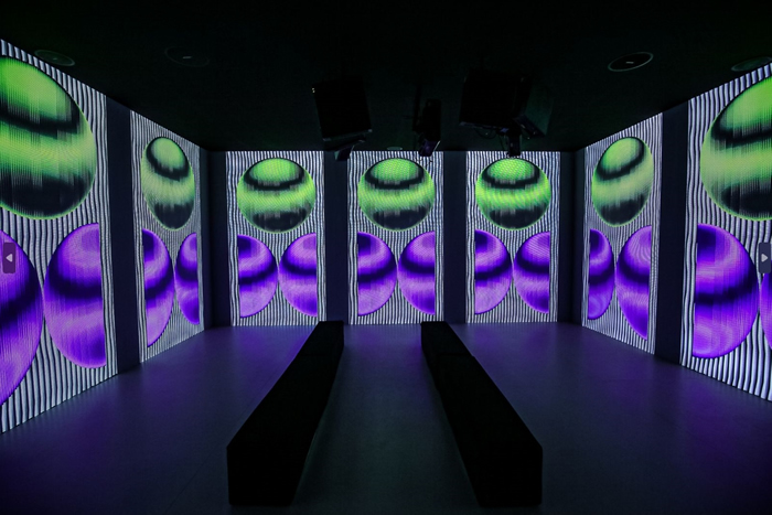 正如本次展覽技術支持OUTPUT內容總監韓溢文所言,和傳統藝術形式相比較,因其媒介的特殊性,大多數數字藝術作品可以在展示和傳播層面更具靈活度(除非藝術家特殊限制),作品可以根據空間尺寸或展示硬件的條件做定制處理,因此既可適配在公共屏幕中,又可以營造沉浸式體驗空間。尤其是應用在“符碼演繹”這樣的場域中,更有利于通過動態的視覺表達充分邀請觀眾在空間中徘徊和感受,在互動的過程中與作品產生新的理解和自我認知,在快速響應新興技術的表達方式同時,又以前沿和先鋒性引領大眾審美。