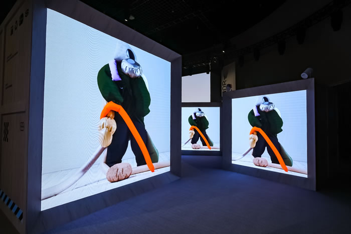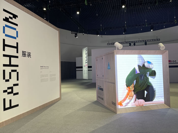 德國藝術家文森特?施文克(Vincent Schwenk)的影像裝置延續了這一討論,在以集裝箱為靈感的同時,巨大的LED屏幕又象征了廣告等大眾傳播的流通途徑?;旌喜剂系摹拔璧浮币彩侵匦屡帕蟹a的過程,對時裝的“消費”與“解碼”最終回到了消費者自己手中,并進行全新個人身份構建的“再編碼”?!胺b”從人類物理身體的束縛中被解放出來,進而也拓展了數字時尚的邊界。五顏六色的搭配與律動的旋律,為整個展覽帶來一絲活躍的氣息,憑添了幾分節奏感。