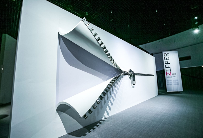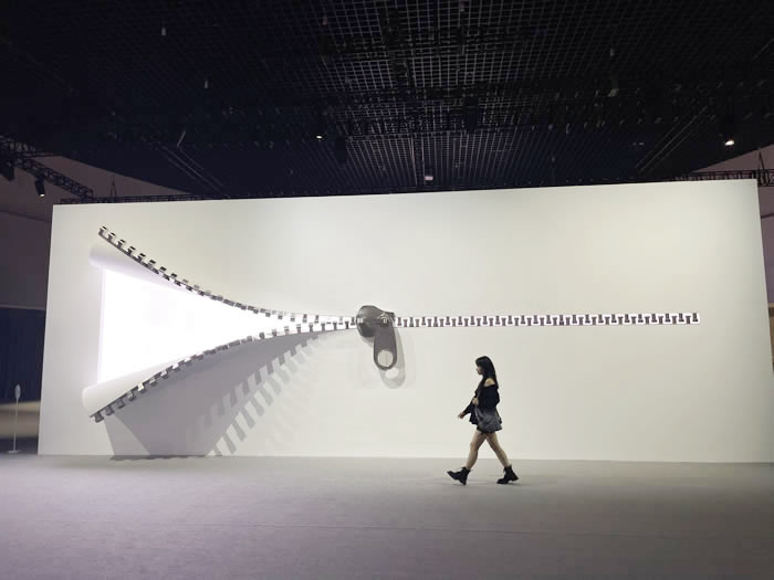 如果說“線條”和“圖案”編制的兩件數字藝術作品給人亂花漸欲迷人眼的視覺沖擊,那么英國藝術家亞歷克斯·錢尼克(Alex Chinneck)的大型燈光裝置作品則相當直觀的以“拉鏈”的形態為觀眾開啟了這場“時裝產業革命”的序幕——作為服裝中的另一重要構件元素,一條“拉鏈”將觀眾從展覽的暗區引至明區,它俏皮地營造了巨墻后面的想象空間:拉鏈背后,布料之下,究竟還蘊含著怎樣的信息和符碼呢?