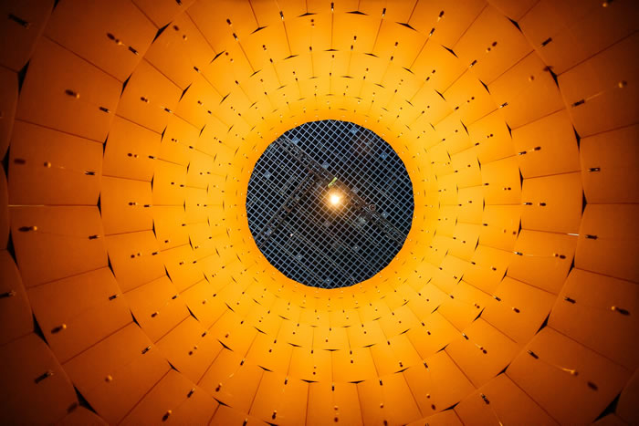 進入裝置作品,機械敲打著盒子形成立體環繞的聲音場域,仰頭向上望去,不禁讓人想到萬神殿的穹頂