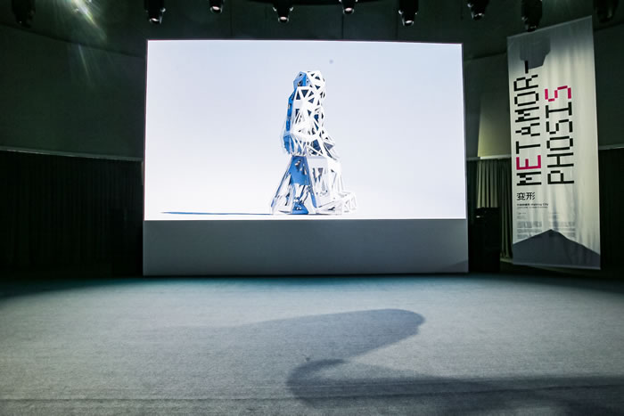 展覽最后,觀眾駐足在英國藝術團體Universal Everything的CG影像《行走的城市》前,面對著這個無休止行走的變形體,浮想聯翩。受到生物形態建筑和諸如扎哈·哈迪德等設計師作品的影響,這座行走的極簡主義建筑不斷變換著形狀、圖案和幾何形態。在白色背景的襯托下,作品展現出各類材料的演變過程,它們持續迭代、進化,并再生產,至此,符碼被徹底解構。一個不斷行走的,不斷變形的人,亦如一個不斷涌現新的建筑的城市,點綴并融化成行走的城市的一部分,它象征著服裝產業不斷更新迭代在編碼、解碼與再編碼的反復交織和循環中——數字織造的路徑沒有終點,時裝的含義與未來也充滿了無限可能。
