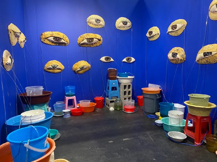 在此次軍械庫展覽中,來自舊金山的想得開畫廊(Micky Meng)單獨展示了加州亞裔藝術家盧南燕(Cathy Lu)的裝置作品《外圍視野》(Peripheral Visions)引得觀眾們的駐足。在藝術博覽會中,畫廊更多選擇展示架上藝術作品,連雕塑都少有呈現,裝置藝術更是鮮有畫廊選擇展出??梢?,想得開畫廊做出了一次大膽的嘗試,而其特殊的內容呈現引得了展位前不斷有觀眾駐足?!锻鈬曇啊氛故玖艘粋€寓言式花園,墻面上懸掛的圖騰樣的眼睛雕塑是按照藝術家本人,以及其他著名亞裔美國女性創作的,如藝術家魯斯·阿薩瓦(Ruth Asawa)、花樣滑冰運動員關穎珊(Michelle Kwan)。每只眼睛都不斷流著用洋蔥釀制的“黃色淚水”,流入從不同中國城購置的常在亞洲社區出現的塑料水桶中。淚水通過水泵不斷循環,暗示著亞裔群體在西方社會所面對的創傷與困境,并渴望通過建立友誼和社群以治愈反亞裔所帶來的創傷。