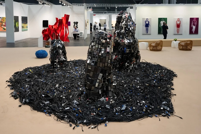 同在“平臺”單元展示的韓裔藝術家沈讓(Jean Shin)帶來了以廢棄的電子設備為材料的作品《擁擠的人群》(Huddled Masses)。廢棄的手機如同化石一樣鑲嵌在電腦電纜的地面上,形成了禪宗園林景觀和傳統中國畫中文人石,映射出人類不斷增長的數字足跡。沈讓的作品站在歷史的背景上對未來進行想象,對觀眾發問,當科技不斷更迭,人類生活是否會被更多的電子垃圾充斥,地球是否能夠承受人類越來越快節奏的消費文化。