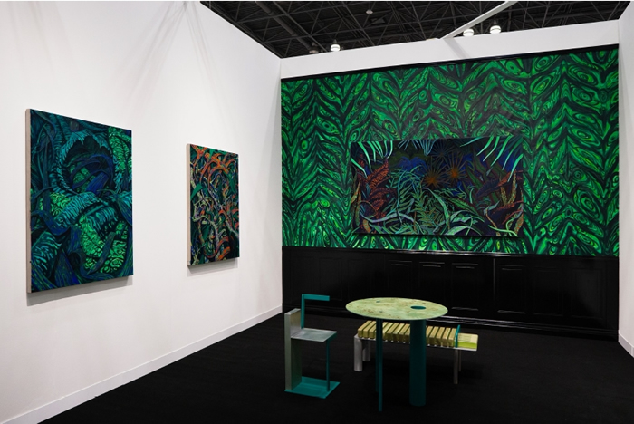 來自紐約本地的晚餐畫廊(Dinner Gallery)在此次軍械庫展覽中選擇以個展的方式呈現中國臺灣藝術家洪恭凡(Phaan Howng)的作品,并且特意邀請藝術家為展位墻面繪上藝術家最具特色的植物圖案,使得整個展位變成了藝術家的個人裝置。藝術家洪恭凡的作品是在描繪對未來世界的想象,她發覺,隨著自然環境的變遷,人們在無法掌控自然環境時,愈發希望在室內制造自然景觀。在研究了中國古代園林繪畫和維多利亞時代的哥特植物文獻后,她開始創作這一系列作品,試圖想象用奇異的植物來填補所有的空間。而此次在軍械庫的展覽,藝術家洪恭凡成功邀請觀眾沉浸在她所想象的奇幻植物世界中去,帶來了一些未來人類與自然共生的想象。
