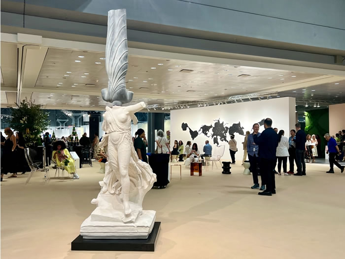 走進軍械庫藝術展,很難不被其中最為特殊的“平臺”單元所吸引。區別于其他方正的隔間展位,“平臺”單元以橢圓形排布位于整個展覽的最中心,創造出一個當代的阿古拉(Agora),古希臘人在公共場合聚集的地方。策展人伊娃·雷斯皮尼(Eva Respini)通過展示12位藝術家的裝置和雕塑作品,為觀眾提供了一個以多維度觀察歷史的窗口。其中中國藝術家徐震的作品《永恒——菩薩立像,勝利女神雕像》通過并置兩個在東西文化中廣為人知的形象,將古代神話與宗教文明帶到現代語境中,讓神明與世俗共處一室,以一種頗具幽默感的方式探索了佛教文化和希臘神話的異同,為觀眾帶來兼具考古觀和全球觀的體驗。