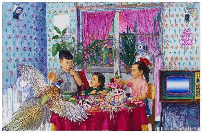 畫面中的三個小孩圍坐在餐桌邊,同樣以具有著典型時代特征的物象組成畫面,然而看似溫馨的場景卻好像充滿了不安,這是由畫面的形式語言帶來的。餐桌上的蛋糕、高腳杯正在融化,流淌的色彩讓整個世界看起來似乎都是要被溶解的,再加上強烈的色彩讓畫面愈加奇幻,造就了這樣的不安感。