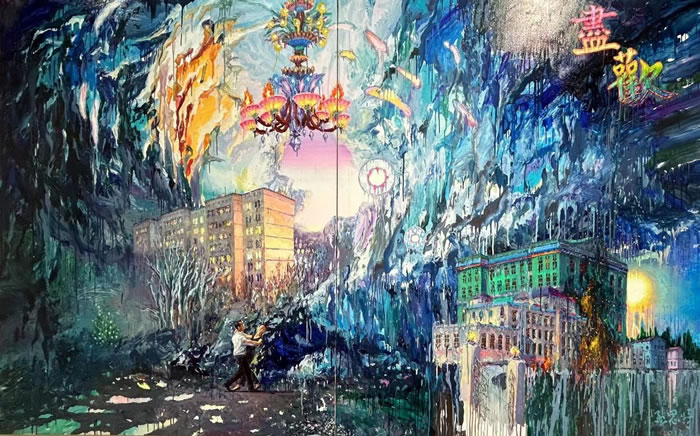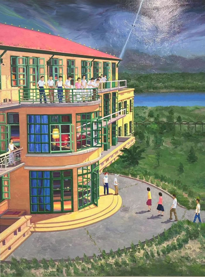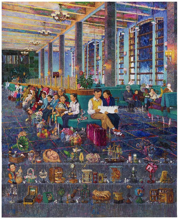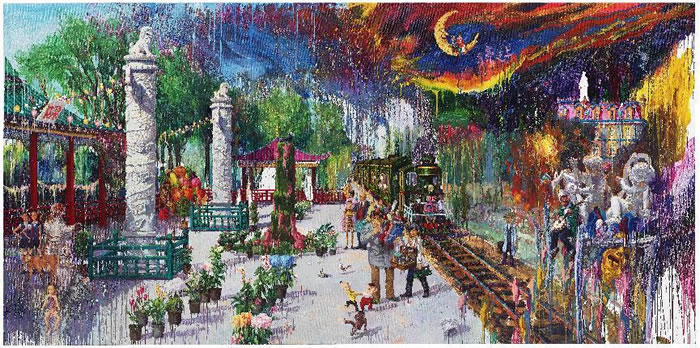 在這幅畫中藝術家描繪的是似曾相識又截然不同的現實,畫面中有許多我們非常熟悉的物象,有華表駐立在路邊,綠皮火車開過路面,這些如夢境般雜糅組合的物象嵌合在一起,將空間也嵌合起來,共同構建這樣一座奇幻的想象空間。正是這樣的奇幻感帶給觀眾“陌異”感,如此熟悉卻不曾相遇。