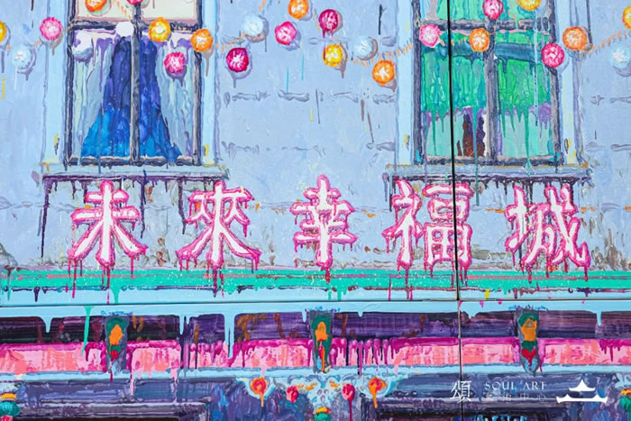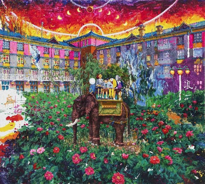 這幅作品有濃烈的超現實氣息,建筑是東方性的,但藝術家把它們的顏色轉換的更具視覺沖擊力,由此模糊了建筑的年代,消除確切的指向性。天空像火焰在燃燒,其中還有日食的痕跡,地上的花叢像是雨林一般藏匿著無數秘密,花朵被賦予了五官,以視覺上的形式美感、主題上想象空間,又構建了一個奇幻世界。這些形象都是藝術家自己純粹的想象,他會先設計好各類形象,再把他們擺放到畫面上。