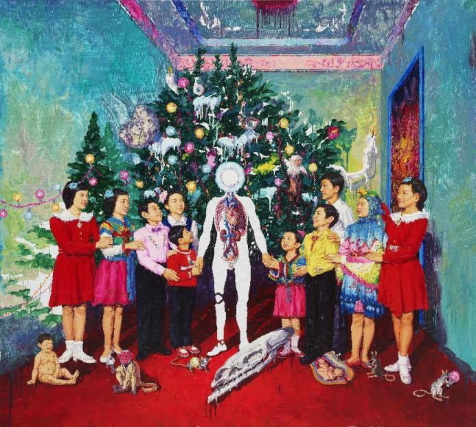 畫面中出現了許多80年代出生的人熟悉的物象,人物衣著樣式具有典型的時代特色,但藝術家通過色彩的強烈感染力又將人物拉出了歷史的時間軸,進入他所制造的超現實世界中。狀為圣誕樹的形象占據了畫面的大部分空間,但它的造型并不標準,樹上的蘋果上長著眼睛,圣誕樹前的白色骷髏等等不速之客的出現充滿了中古的想象。