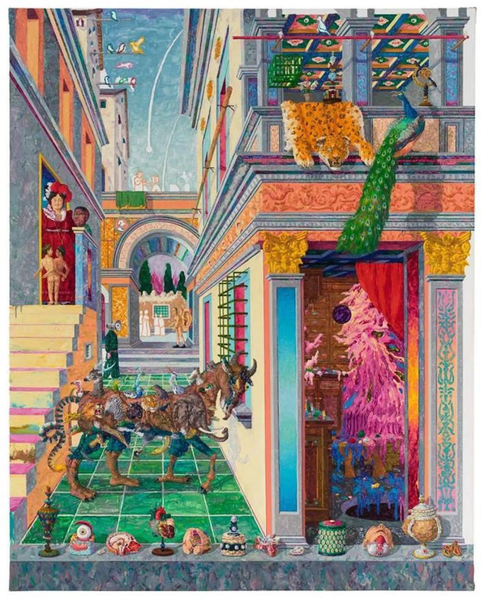 這張畫似乎看起來有著某種異域風采,藝術家挪用了文藝復興時期的祭壇畫,直接運用了其中的建筑形式和構圖方式,把圣母形象和建筑的顏色替換為中國傳統的視覺形象,從而產生新的切面,讓畫面具有了某種異域感。畫面中配色的方式來自中國傳統美學,尤其是明清時期宮廷藝術,其與西方建筑結合產生了新的視覺效果。