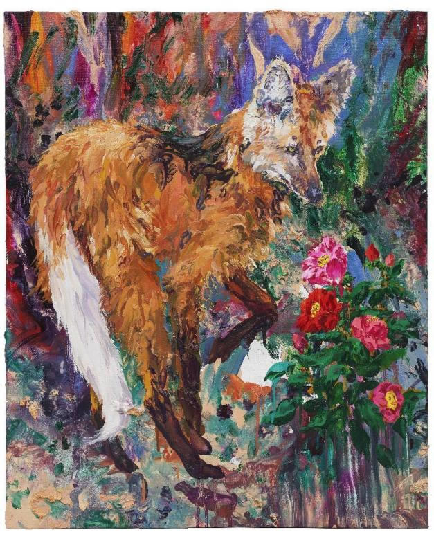 這張作品在主題上是《滿庭花》的延續,在滿庭花上有一只狐貍在睡覺,在這一件作品里藝術家聚焦了這只狐貍,畫與畫之間形成了上下文關系。