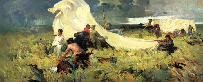 詹建俊 《起家》布面油畫 1957年 140厘米×348厘米 中央美術學院美術館藏