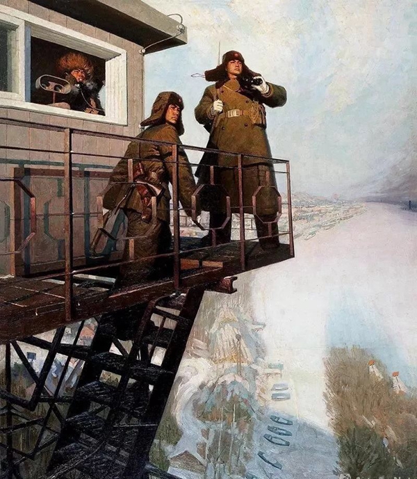 1973年12月,在北大荒當農工并參加兵團美術班業余創作的沈嘉蔚與李斌等人到烏蘇里江畔采風,其間登上了邊防站的瞭望塔,于是沈嘉蔚形成了《為我們偉大祖國站崗》(以下簡稱《站崗》)一畫的初步構思,并產生了很強烈的創作沖動?!墩緧彙芬划嬜畲蟮奶攸c,也是其最為成功之處,就在于它的透視關系,即同時存在仰視視角和俯視視角。